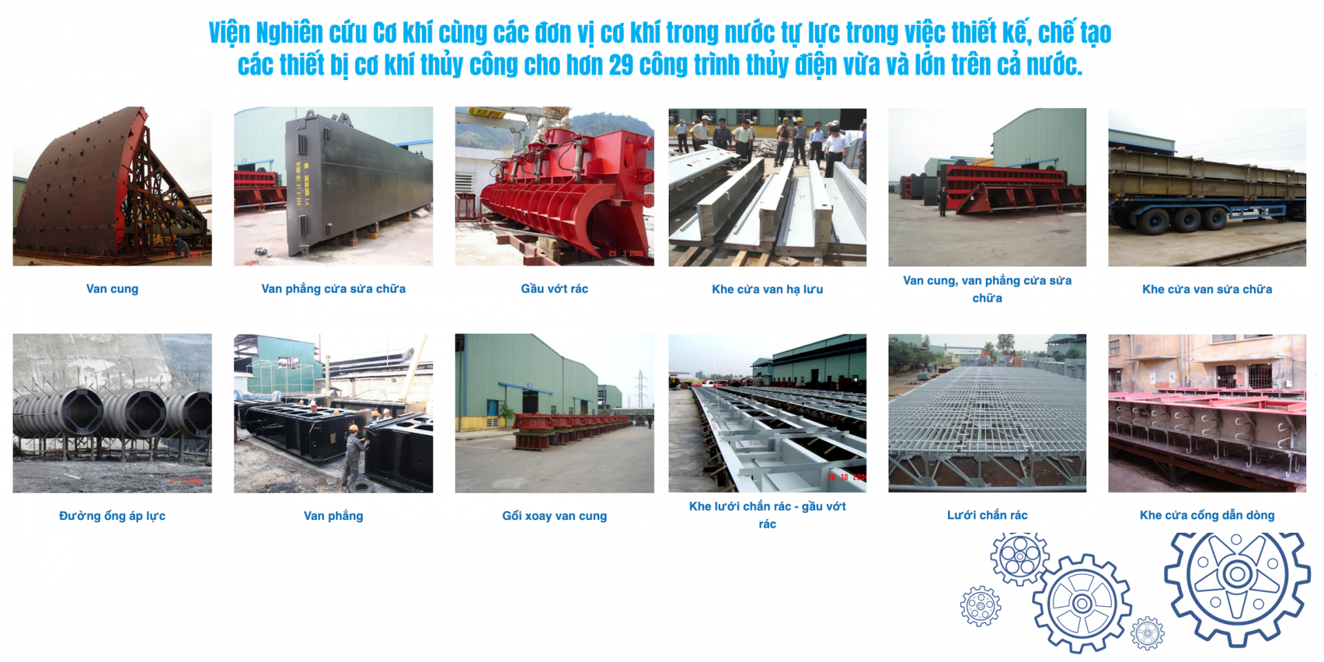 Trong lĩnh vực thủy điện, Viện Nghiên cứu Cơ khí đã được giao nhiệm vụ chủ trì tiếp nhận chuyển giao công nghệ phần thiết kế, chế tạo thiết bị cơ khí thủy công cho các công trình thủy điện theo Quyết định 797/QĐ-TTg của Thủ tướng Chỉnh phủ cho dự án đầu tiên là thủy điện A Vương. Viện đã tiếp nhận công nghệ từ Ukraine để làm chủ thiết kế, công nghệ chế tạo các thiết bị cơ khí thủy công. Đến nay, Viện đã cùng các đơn vị cơ khí trong nước tự lực trong việc thiết kế, chế tạo các thiết bị cơ khí thủy công cho hơn 29 công trình thủy điện vừa và lớn trong nước, trong đó có công trình thủy điện Sơn La (2.400 MW) và Lai Châu (1.200 MW), tạo thêm nhiều công ăn việc làm cho ngành cơ khí trong nước, giảm giá thành sản phẩm, góp phần phát điện sớm 3 năm với thủy điện Sơn La và 1 năm với thủy điện Lai Châu, mang lại hiệu quả kinh tế cao cho các dự án này. Thành công này đánh dấu bước trưởng thành quan trọng của ngành cơ khí thủy điện Việt Nam, đặt nền tảng cho việc tham gia chế tạo thiết bị cho các dự án năng lượng trong khu vực.