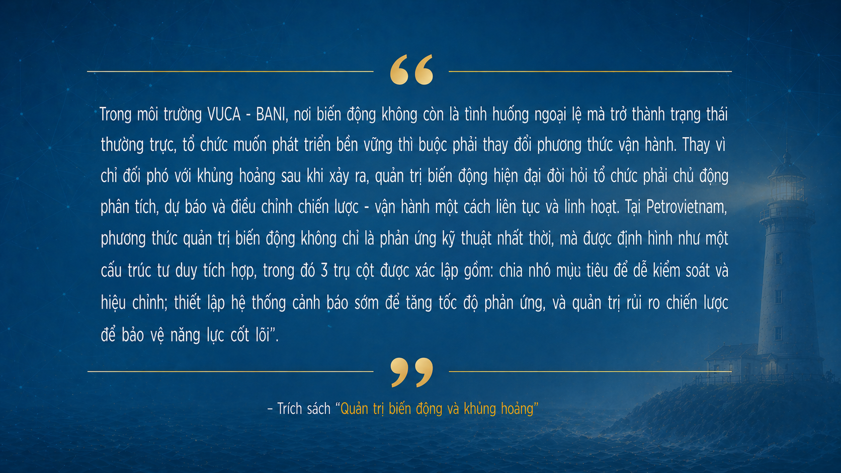 Trong môi trường VUCA - BANI, nơi biến động không còn là tình huống ngoại lệ mà trở thành trạng thái thường trực, tổ chức muốn phát triển bền vững thì buộc phải thay đổi phương thức vận hành. Thay vì chỉ đối phó với khủng hoảng sau khi xảy ra, quản trị biến động hiện đại đòi hỏi tổ chức phải chủ động phân tích, dự báo và điều chỉnh chiến lược - vận hành một cách liên tục và linh hoạt. Tại Petrovietnam, phương thức quản trị biến động không chỉ là phản ứng kỹ thuật nhất thời, mà được định hình như một cấu trúc tư duy tích hợp, trong đó 3 trụ cột được xác lập gồm: chia nhỏ mục tiêu để dễ kiểm soát và hiệu chỉnh; thiết lập hệ thống cảnh báo sớm để tăng tốc độ phản ứng, và quản trị rủi ro chiến lược để bảo vệ năng lực cốt lõi.