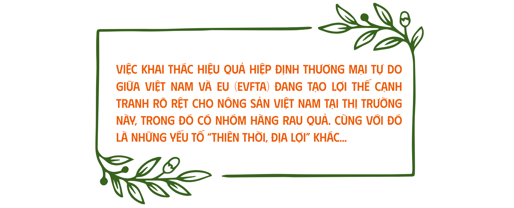Lợi thế thuế quan từ Hiệp định Thương mại tự do Việt Nam - EU (EVFTA) là một trong những yếu tố quan trọng tiếp tục thúc đẩy xuất khẩu rau quả sang khối thị trường này. EU đã thực hiện mở cửa rất mạnh cho hàng rau quả Việt Nam (xóa bỏ 94% trong tổng số 547 dòng thuế với rau quả và các chế phẩm từ rau quả ngay từ khi Hiệp định có hiệu lực, trong đó có nhiều sản phẩm thế mạnh của Việt Nam như: vải, nhãn, chôm chôm, thanh long, dứa, dưa… Điều này tạo ra lợi thế lớn cho rau quả Việt Nam tại thị trường EU kể từ khi thực thi EVFTA, đặc biệt cạnh tranh so với những nguồn cung rau quả khác chưa có FTA với EU.