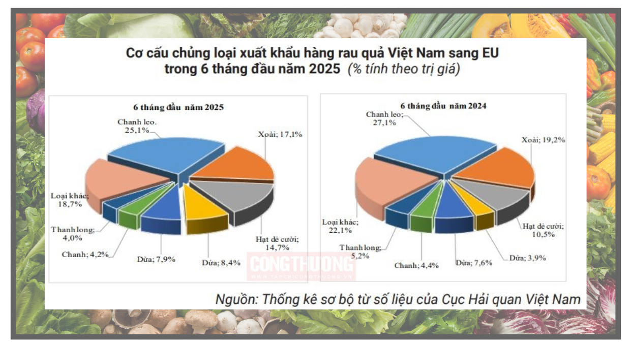 Trong 6 tháng đầu năm 2025, xuất khẩu hầu hết các chủng loại rau củ, trái cây sang thị trường EU đều ghi nhận mức tăng trưởng mạnh ở mức từ hai đến ba con số so với cùng kỳ năm 2024, ngoại trừ mít, vải... giảm. Chanh leo là mặt hàng có kim ngạch xuất khẩu sang thị trường EU lớn nhất trong 6 tháng đầu năm 2025, đạt 58,59 triệu USD, tăng 112,9% so với cùng kỳ năm 2024, chiếm 25,1% tổng trị giá xuất khẩu hàng rau quả sang thị trường này.