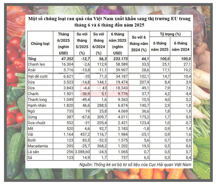 Theo Cục Xuất nhập khẩu và Trung tâm thông tin Công nghiệp và Thương mại, Bộ Công Thương tính toán từ số liệu thống kê của Cục Hải quan Việt Nam, kim ngạch xuất khẩu rau quả của Việt Nam sang thị trường EU trong tháng 6/2025 đạt 47,4 triệu USD, giảm 12,7% so với tháng 5/2025, nhưng tăng 56,3% so với tháng 6/2024. Đây là tháng kim ngạch xuất khẩu đạt cao thứ hai kể từ đầu năm 2024, chỉ sau tháng 5/2025. Tính chung 6 tháng đầu năm 2025, tổng kim ngạch xuất khẩu rau quả của Việt Nam sang thị trường EU đạt 233,2 triệu USD, tăng 44,1% so với cùng kỳ năm 2024.