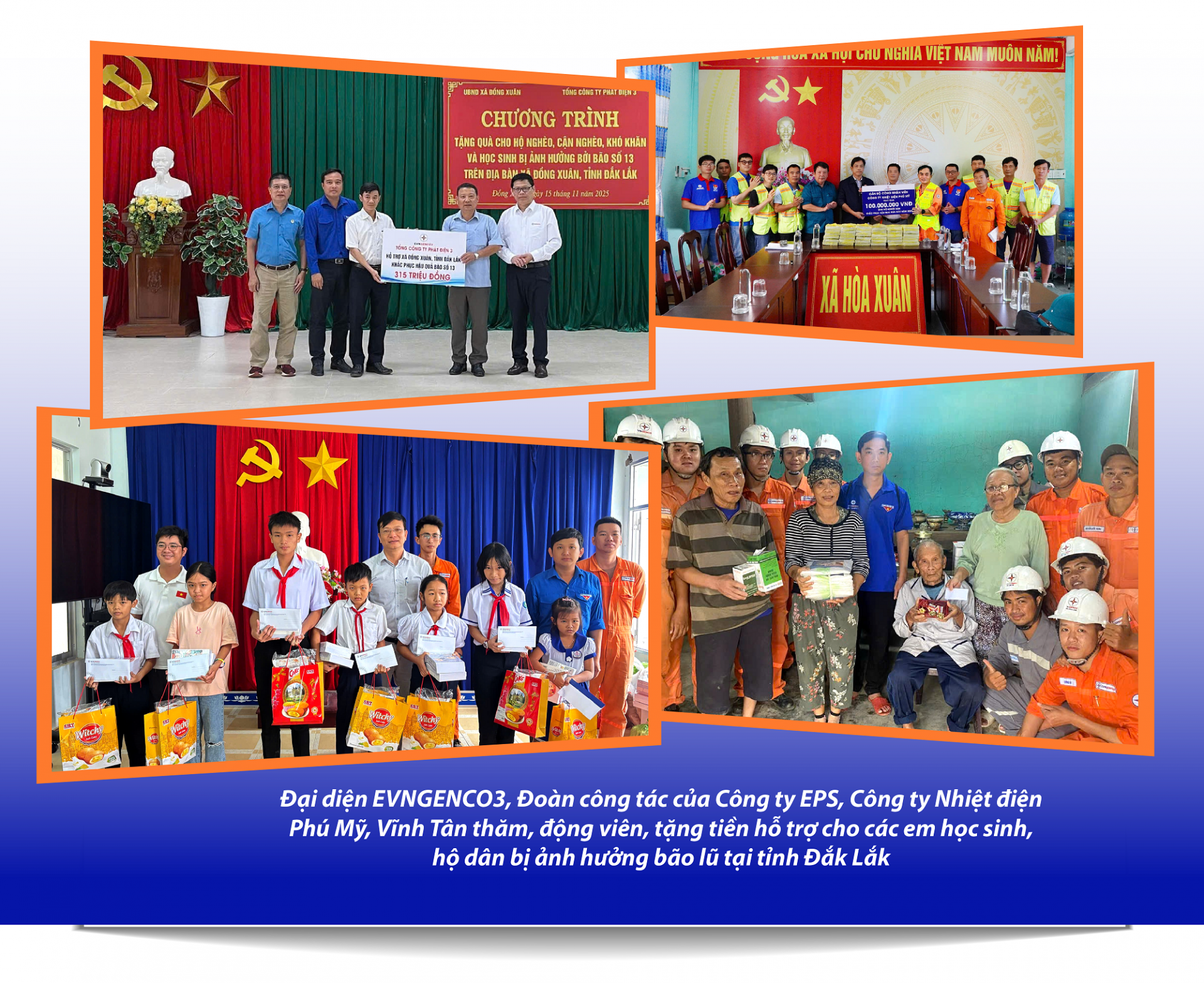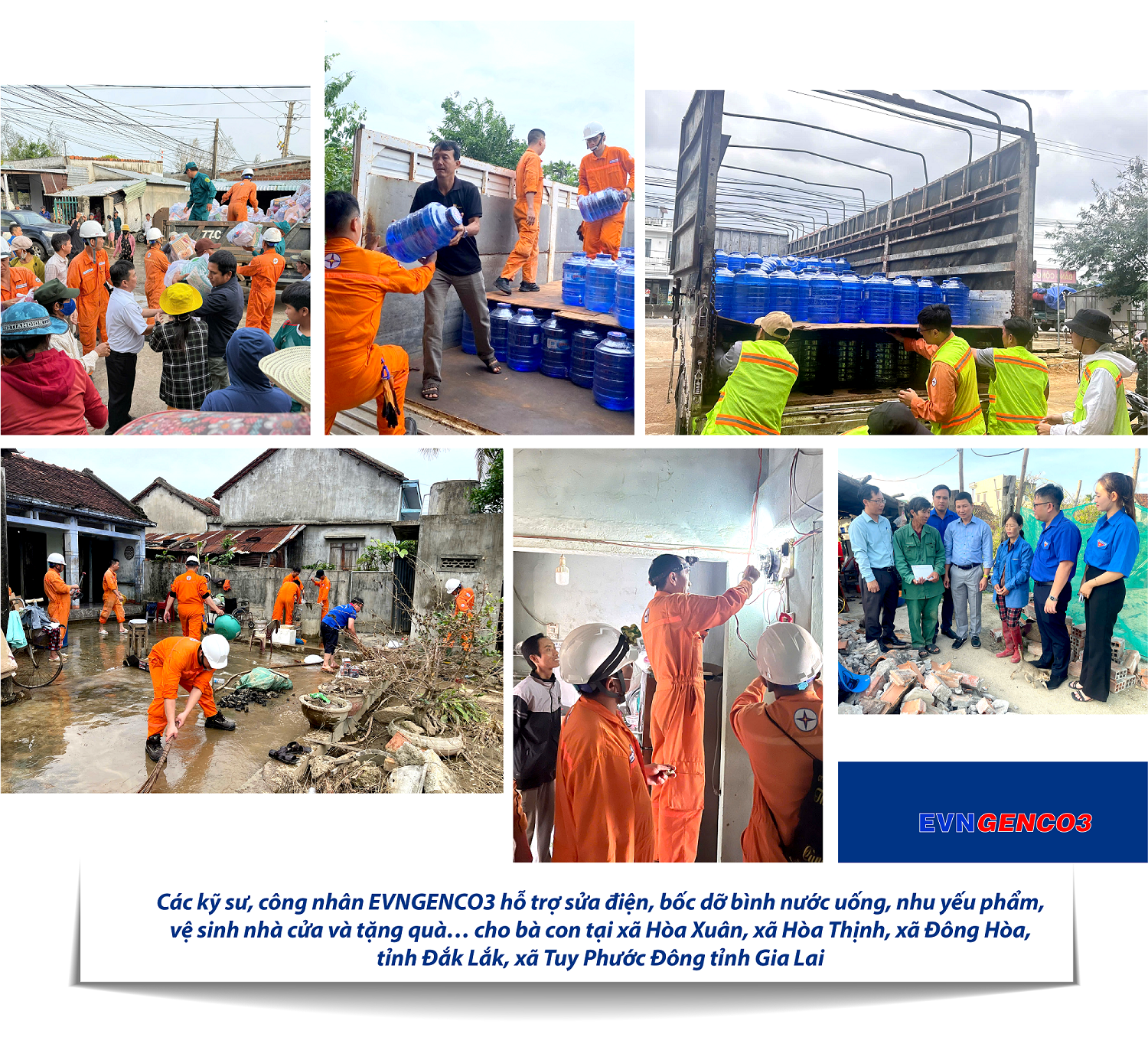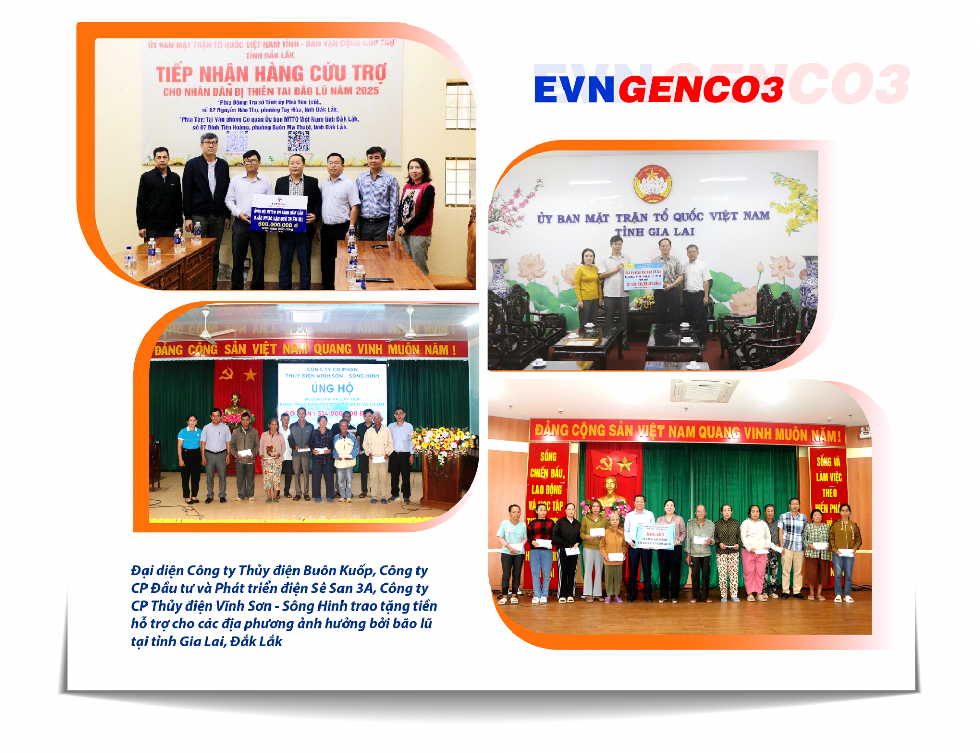 Các đơn vị tích cực tham gia gồm Công ty EPS, Nhiệt điện Phú Mỹ, Nhiệt điện Vĩnh Tân, Thủy điện Buôn Kuốp, Công ty Cổ phần Nhiệt điện Bà Rịa và Công ty Cổ phần Thủy điện Vĩnh Sơn - Sông Hinh (đơn vị liên kết đứng chân trên địa bàn). Đồng thời, thăm tặng quà, hỗ trợ an sinh xã hội cho người dân địa phương bị ảnh hưởng; tổ chức quyên góp, hỗ trợ chi phí cho các địa phương tái thiết sau bão lũ. Tổng số tiền hỗ trợ của EVNGENCO3 cho các địa phương là hơn 7 tỷ đồng.