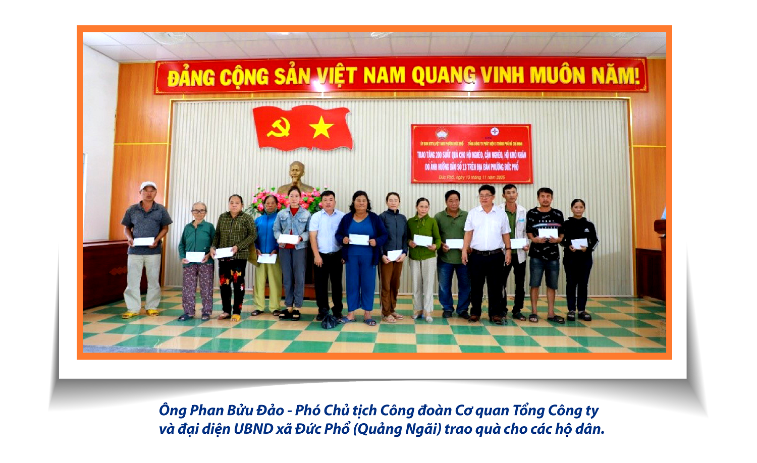 Trong đợt 2 (từ ngày 25/11 đến ngày 29/11/2025), Tổng Công ty tiếp tục tổ chức các đoàn công tác trực tiếp đến thăm hỏi, trao tặng quà cho các gia đình có hoàn cảnh khó khăn, nhà cửa bị ngập sâu, bị thiệt hại nặng do mưa lũ tại xã Tuy Phước Đông (Gia Lai), xã Hòa Xuân và Hòa Thịnh (Đắk Lắk), xã D’Ran (Lâm Đồng) gồm 800 phần tiền mặt (500.000đồng/phần), 800 phần nhu yếu phẩm, thuốc y tế, chăn, quần áo chống nước, 350 bộ đèn năng lượng mặt trời, 16 máy phát điện.