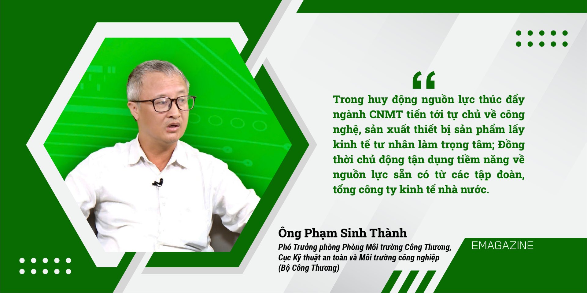 Trao đổi tại Tọa đàm, ông Phạm Sinh Thành – Cục Kỹ thuật an toàn và Môi trường công nghiêp cho biết để “ đảm bảo độc lập tự chủ về công nghệ, thiết bị sản phẩm phục vụ bảo vệ môi trường” bên cạnh thúc đẩy KHCN Chương trình CNMT 2025 -2030 cũng đã định hướng giải pháp trong huy động nguồn lực thúc đẩy Ngành là lấy kinh tế tư nhân làm trọng tâm, cùng với đó một số nhiệm vụ được giao cụ thể cho các cái hiệp hội ngành nghề nhằm khơi thông các nguồn lực của các thành phần kinh này tham gia vào phát triển CNMT.