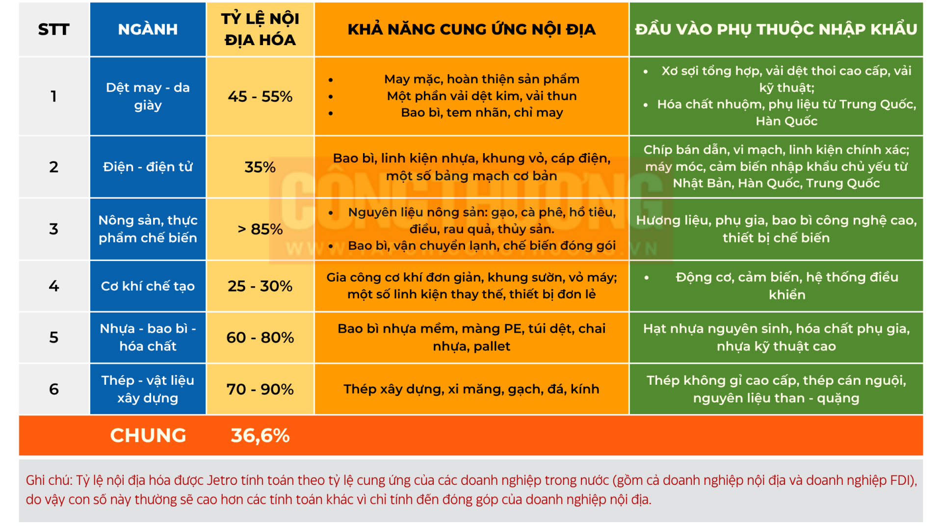 Tuy nhiên, nền sản xuất của Việt Nam hiện vẫn còn nằm trong cấp thấp trong chuỗi giá trị toàn cầu với hầu hết các ngành công nghiệp, giá trị gia tăng còn thấp, cạnh tranh cao, thâm dụng lao động giá rẻ, trong khi tài nguyên sử dụng chưa hợp lý, chưa hiệu quả, dẫn đến những rủi ro về ô nhiễm môi trường và phát triển thiếu bền vững. Trong khi đó, trên thị trường quốc tế, đặc biệt là trong các FTA và khung khổ hợp tác song phương, đa phương khác mà Việt Nam tham gia, tỷ lệ nội địa hóa là tiêu chí trọng tâm để được hưởng ưu đãi thuế quan.