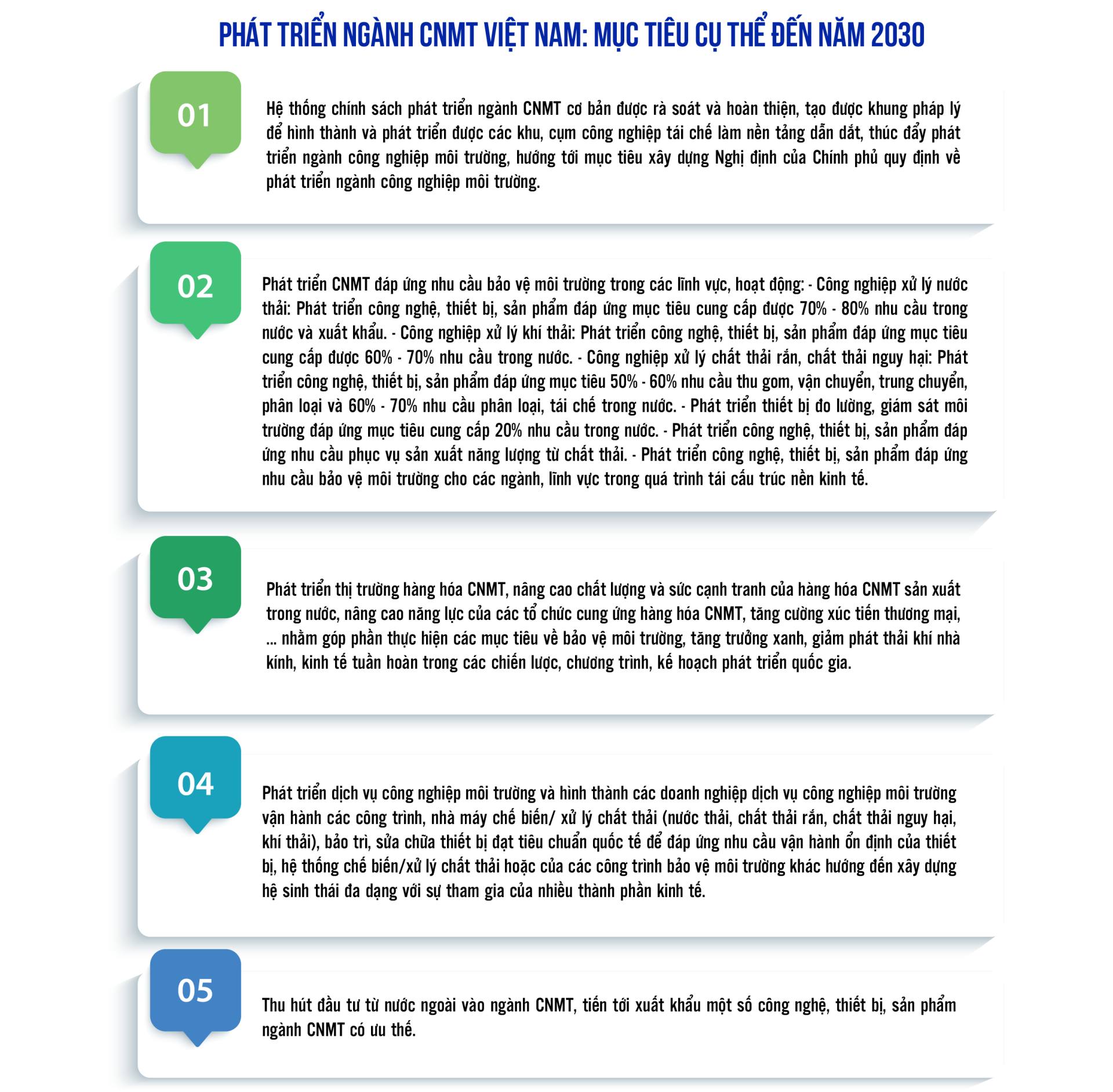Thực tế ngành Công nghiệp môi trường Việt Nam bắt đầu được quan tâm định hình rõ nét khi các báo cáo hiện trạng môi trường quốc gia và các bộ ngành lần lượt đưa nội dung quản lý nước thải, chất thải rắn, xử lý khí thải và kinh tế tuần hoàn vào chương trình hành động quốc gia. Giai đoạn 2016–2020, các văn bản chuyên môn và báo cáo thống kê ghi nhận sự phát triển ban đầu của chuỗi cung ứng thiết bị, dịch vụ và giải pháp xử lý môi trường, tuy nhiên phần lớn công nghệ tiên tiến vẫn phụ thuộc vào nhập khẩu… Số liệu thống kê cũng cho thấy, nhu cầu xử lý nước thải, rác thải rắn và chất thải nguy hại tăng mạnh do đô thị hoá, phát triển công nghiệp và thương mại điện tử; tuy nhiên năng lực xử lý tập trung trên toàn quốc hiện vẫn còn hạn chế, tỷ lệ cơ sở, làng nghề, khu công nghiệp có hệ thống xử lý đạt yêu cầu thấp; nhiều công nghệ then chốt và thiết bị chuyên sâu trong lĩnh vực CNMT hiện vẫn do doanh nghiệp FDI cung cấp hoặc nhập khẩu.