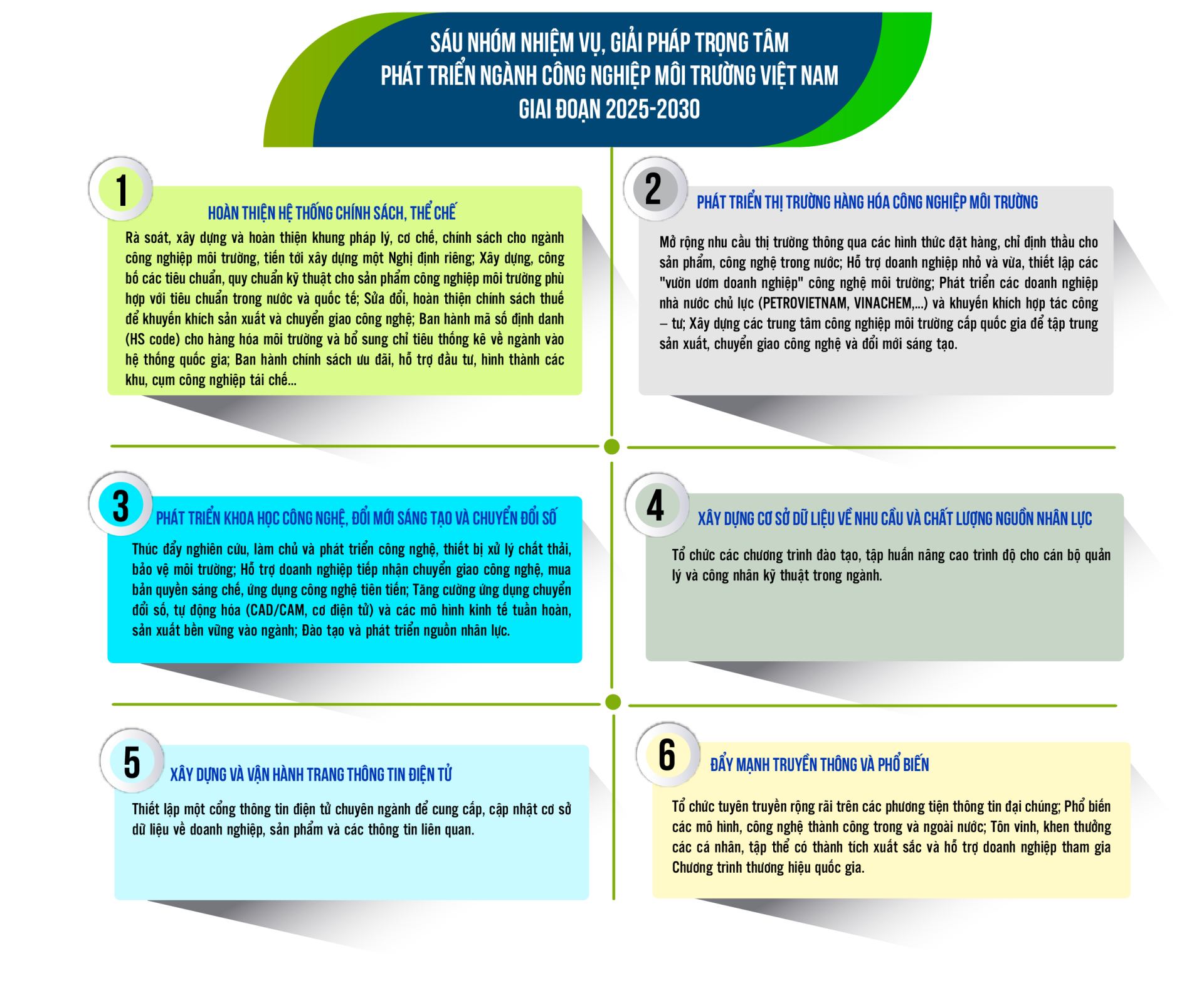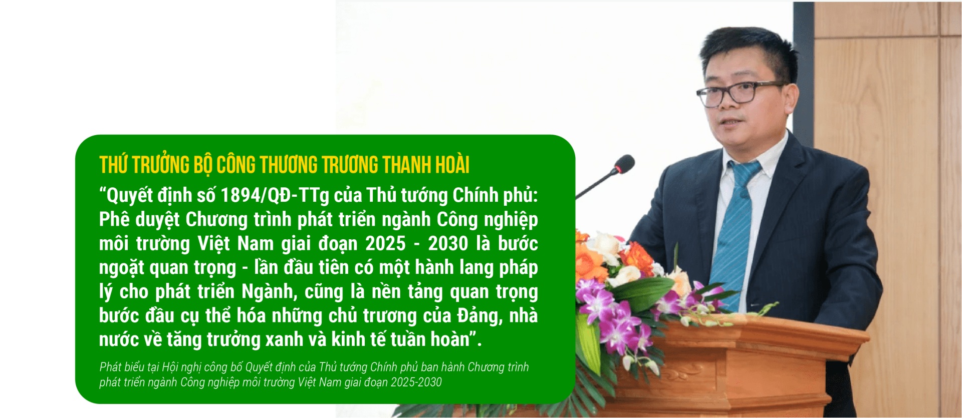 Mặc dù phát triển ngành Công nghiệp môi trường đã được Đảng, Nhà nước quan tâm từ rất sớm. Tuy nhiên thực tế nhiều rào cản, khiến nguồn lực đầu tư cho công nghiệp môi trường chưa cao, thị trường và chuỗi doanh nghiệp môi trường chưa phát triển mạnh…Ngày 04/9/2025 vừa qua, Thủ tướng Chính phủ đã ban hành Quyết định số 1894/QĐ-TTg (Quyết định 1894/QĐ-TTg) phê duyệt Chương trình phát triển ngành công nghiệp môi trường Việt Nam giai đoạn 2025-2030 (Chương trình). Mục tiêu là đưa Công nghiệp môi trường phát triển mạnh mẽ thành ngành kinh tế xanh độc lập, đóng góp quan trọng trong cơ cấu kinh tế, hoàn thiện khung pháp lý, nâng cao năng lực công nghệ, nguồn lực, sản xuất trong nước, phát triển thị trường dịch vụ môi trường và thúc đẩy mô hình kinh tế tuần hoàn; đồng thời là bước chuẩn bị cho việc thực hiện các cơ chế kinh tế mới (ví dụ CBAM); đảm bảo độc lập tự chủ về công nghệ thiết bị trong giải quyết các thách thức liên quan đến bảo vệ môi trường trong nước và xuất khẩu…