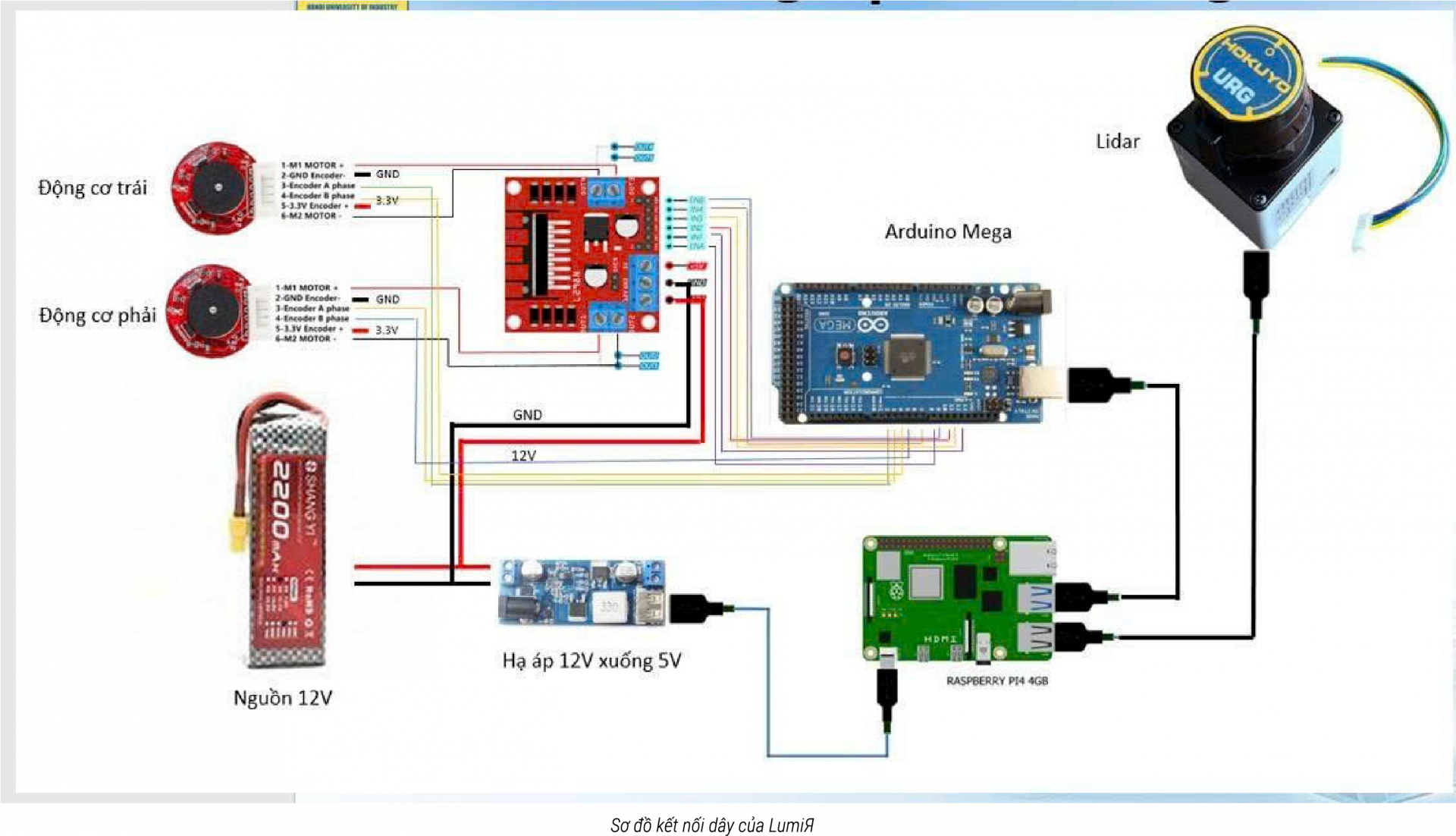 Về bản chất, LumiЯ được xây dựng như một robot di động tích hợp đa cảm biến. “Thần kinh cảm biến” của robot là sự kết hợp giữa nhiều loại cảm biến khác nhau: LiDAR để quét không gian xung quanh theo dạng 2D hoặc 3D, cảm biến siêu âm và hồng ngoại để đo khoảng cách và phát hiện chướng ngại vật ở tầm gần, kết hợp với GPS để định vị trong môi trường ngoài trời. Dữ liệu từ các cảm biến này liên tục được truyền về bộ điều khiển trung tâm, nơi các thuật toán xử lý tín hiệu và trí tuệ nhân tạo phân tích, tổng hợp và đưa ra quyết định di chuyển.