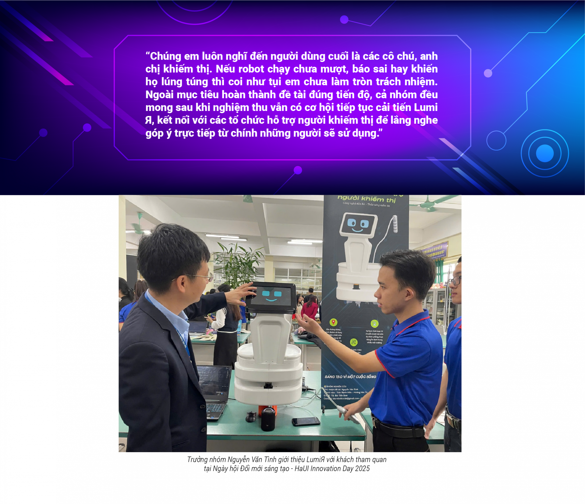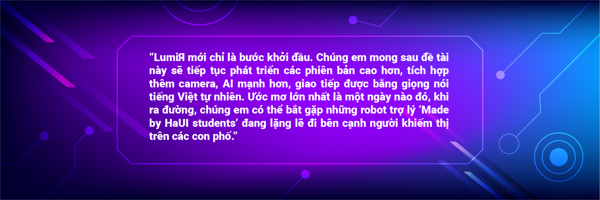 Từ một ý tưởng nhen lên trong những giờ học trên giảng đường Đại học Công nghiệp Hà Nội đến một sản phẩm robot trợ lý mang tính nhân văn, LumiЯ cho thấy sức mạnh của khoa học công nghệ khi được đặt đúng chỗ, bên cạnh những người dễ bị bỏ lại phía sau. Và có lẽ, “ánh sáng” mà LumiЯ mang đến không chỉ dành cho người khiếm thị, mà còn là nguồn cảm hứng để nhiều thế hệ sinh viên sau này tiếp tục bước vào con đường nghiên cứu vì cộng đồng, ở những lĩnh vực mới, với những giấc mơ còn dài hơn một đề tài khoa học.