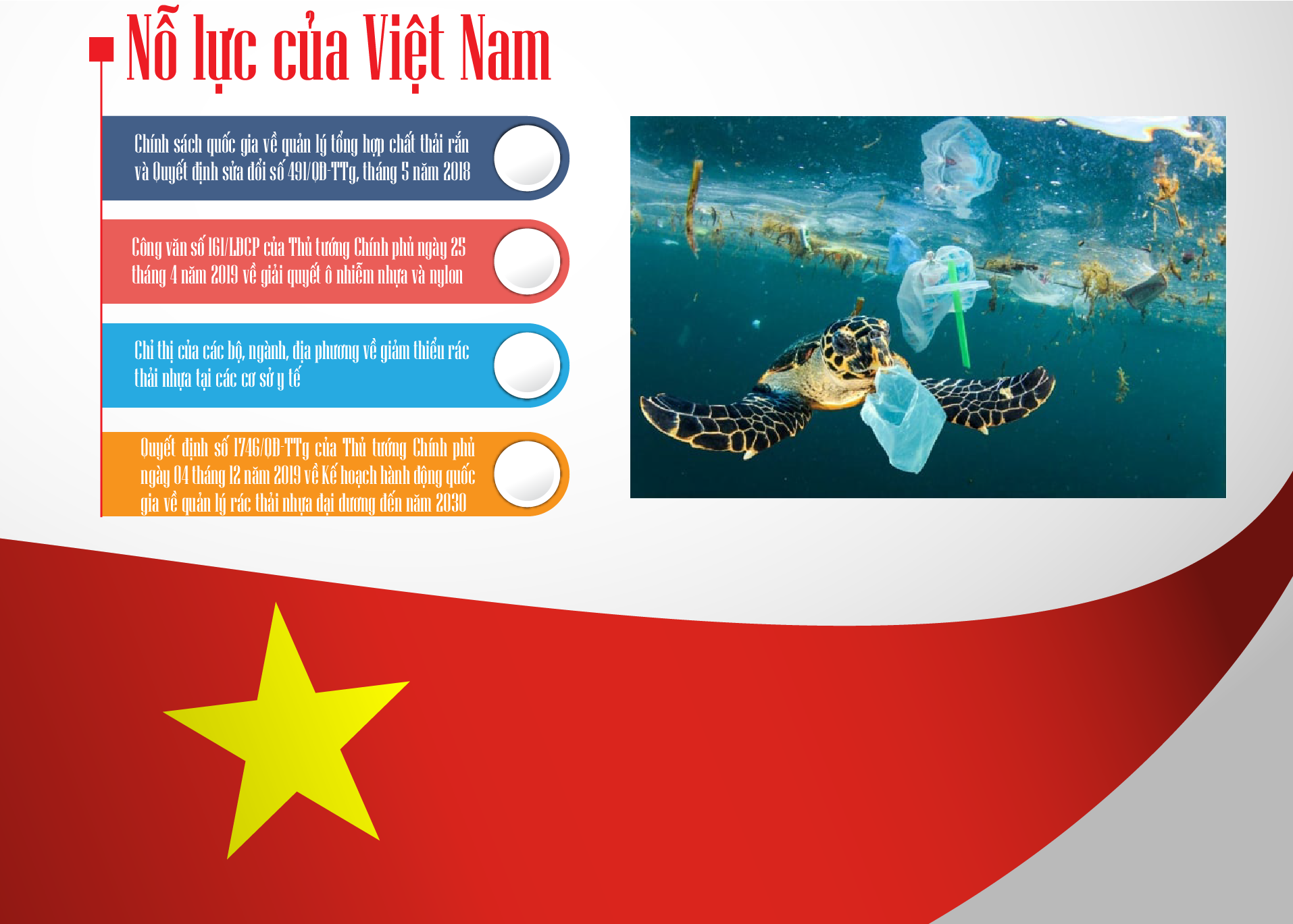 Thực tế Việt Nam đã và đang tích cực tham gia các cơ chế hợp tác quốc tế về giảm thiểu rác thải nhựa, đồng thời tiên phong trong việc triển khai Đối tác hành động quốc gia về nhựa (NPAP). Chính phủ cũng đã ban hành nhiều chính sách quan trọng như: Luật Bảo vệ môi trường 2020; Kế hoạch hành động quốc gia về rác thải nhựa đại dương; Chính sách trách nhiệm mở rộng của nhà sản xuất (EPR); Quyết định số 1746/QĐ-TTg về giảm thiểu ô nhiễm nhựa đại dương; Quyết định số 222/QĐ-TTg về thực hiện kinh tế tuần hoàn; Quyết định số 923/QĐ-TTg năm 2025 về thi đua đổi mới sáng tạo và chuyển đổi số.