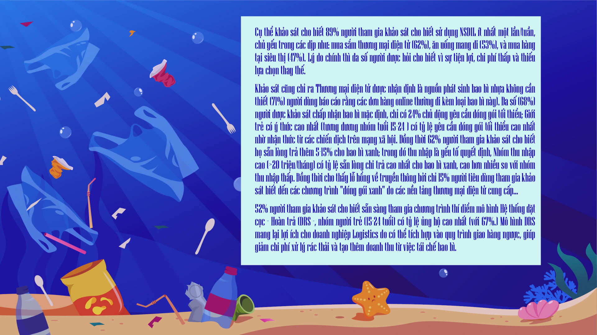Từ các số liệu, Khảo sát chỉ ra TMĐT và logistics là động lực chính thúc đẩy sử dụng nhựa một lần, nhưng cũng là cơ hội để triển khai các giải pháp bền vững; Đồng thời triển khai đồng bộ EPR & DRS có thể giảm 20 - 30% rác thải nhựa, với doanh nghiệp TMĐT giữ vai trò tiên phong; Áp dụng mô hình kinh doanh DRS doanh nghiệp có thể hoàn vốn chi phí đầu tư trong 2-3 năm nhờ doanh thu từ tái chế và lòng trung thành của khách hàng (từ kinh nghiệm thực tế mô hình DRS đã được áp dụng thành công ở Đức). Đồng thời Khảo sát đề xuất tại Việt Nam, Doanh nghiệp TMĐT(như Tiki, GHTK....) nên hợp tác với các nhà tái chế, dùng dữ liệu để cá nhân hóa ưu đãi nhằm thúc đẩy hành vi bền vững.