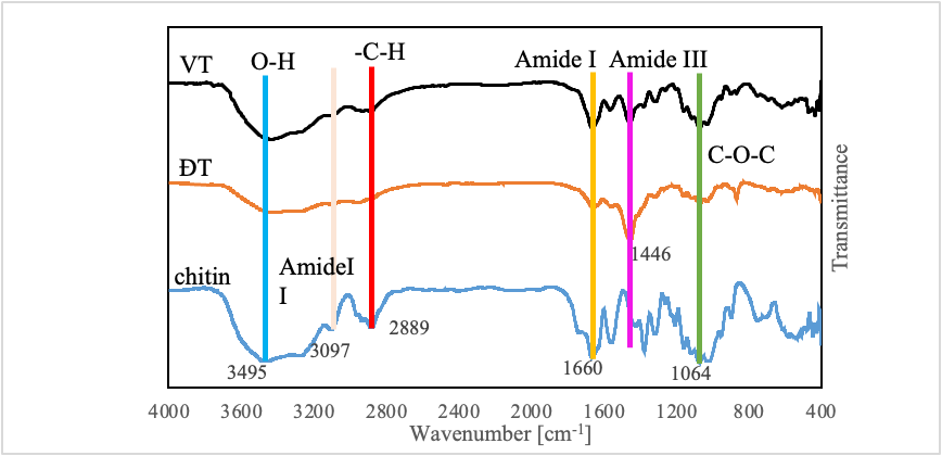 Tính chất của vật liệu chitin sau xử lý đầu tôm, vỏ tôm và của chitin thương mại phân tích bằng Phổ hồng ngoại FT-IR được thể hiện ở Hình 3. Có thể thấy, peak FT-IR của chitin thương mại đầu tôm và vỏ tôm, vật liệu sau tổng hợp có các nhóm chức ban đầu của chitin không bị thay đổi, cụ thể ở bước sóng 3406 - 3495 cm-1 cho thấy có sự xuất hiện của liên kết O - H, trong khoảng bước sóng 1011 - 1064 cm-1 thể hiện nhóm C - O - C và nhóm C - H tại bước sóng 2889 cm-1 trong cấu trúc của chitin. Tương tự, có thể quan sát thấy peak của nhóm Amide II (N - H) tại bước sóng 3097 cm-1, nhóm Amide III (C - N) tại bước sóng 1446 cm-1, nhóm Amide I (NHCOCH3) tại 2 peak 1672 cm-1 và 1660 cm-1, sự xuất hiện của 2 peak của nhóm Amide I này cho thấy đây là cấu trúc α - Chitin (Murat Kaya và cộng sự, 2017). Trong dãy FT - IR của VT và ĐT tại bước sóng 902 cm-1 có sự xuất hiện của nhóm Calcite nhưng sau quá trình chiết tách FT - IR của Chitin không còn thể hiện peak của nhóm Calcite, chứng minh quá trình khử khoáng đạt hiệu quả tốt.