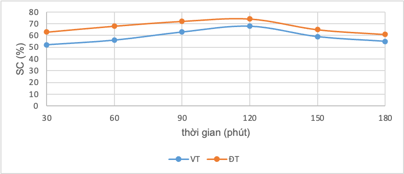 Dựa vào thực nghiệm có thể thấy, độ ngậm nước của chitin của ĐT (đầu tôm) tăng (từ 0-75%) còn VT (võ tôm) tăng (từ 0-69%), sau đó cả hai vật liệu này giảm dần không đáng kể. Dựa vào kết quả nghiên cứu của ( Ozel, ¨ N., & Elibol, M -2021) tính cơ học của vật liệu chitin từ ĐT (đầu tôm) và VT (vỏ tôm) là khá tốt. (Hình 5)