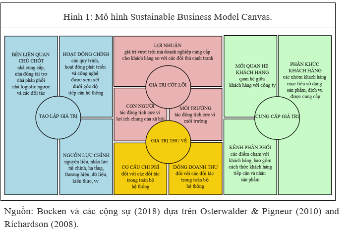 Song song với việc giải quyết các vấn đề mang tính cấp bách của thời đại như nghèo đói, tài nguyên cạn kiệt và biến đổi khí hậu, các SDG cũng cung cấp nền tảng cho sự đổi mới trong kinh doanh [23]. Mô hình kinh doanh bền vững (Sustainable Business Model - SBM) được coi là mô hình kinh doanh lý tưởng tập trung vào việc tạo ra tác động tích cực đến môi trường và xã hội thông qua vai trò của doanh nghiệp [25]. SBM dựa trên các khía cạnh kinh tế, môi trường và xã hội của tính bền vững trong việc xác định mục đích của tổ chức, sử dụng 3 yếu tố cốt lõi là con người, lợi nhuận, môi trường để đo lường hiệu suất; xem xét nhu cầu của tất cả các bên liên quan thay vì ưu tiên kỳ vọng của cổ đông; coi thiên nhiên là một bên liên quan và thúc đẩy quản lý môi trường; góc nhìn ở cấp độ hệ thống để lấp đầy khoảng trống thể chế liên quan đến sức khỏe, nghèo đói, giáo dục và môi trường bên cạnh cấp độ công ty [25]. Khác với Business Model Canvas thông thường trong xây dựng kế hoạch kinh doanh nhằm cung cấp thông tin và phân tích thị trường và tìm ra phương án gia tăng lợi nhuận gồm 9 yếu tố xác định khái quát ý tưởng và mục tiêu kinh doanh của doanh nghiệp [1]. Nghiên cứu này dựa trên lý thuyết mô hình Sustainable Business Model Canvas đề xuất mô hình nhà cung ứng nguyên liệu sản xuất trong thời trang bền vững, theo đuổi giải pháp kinh tế tuần hoàn và hướng tới đạt các Mục tiêu phát triển bền vững.