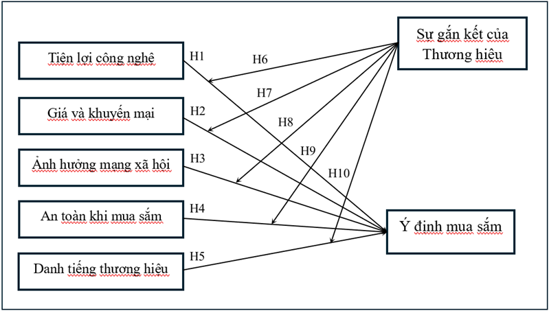 Những đổi mới về mặt công nghệ trên các sàn TMĐT đã và đang làm thay đổi đáng kể các hành vi mua sắm của người tiêu dùng, đặc biệt là giới trẻ, những người có khả năng tiếp cận tốt với các ứng dụng này. Từ những cơ sở lý thuyết đã phân tích ở trên, tác giả đưa ra mô hình nghiên cứu, như Hình 1, cùng với các giả thuyết, để nghiên cứu về mối quan hệ tuyến tính giữa các biến trong việc đi đến ý định mua sắm của khách hàng.