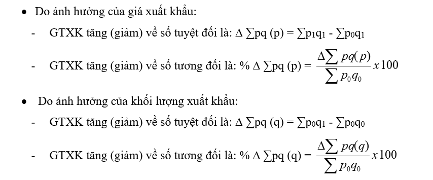 Các lượng tăng giảm của giá trị xuất khẩu do ảnh hưởng của giá xuất khẩu và lượng xuất khẩu được tính như sau: