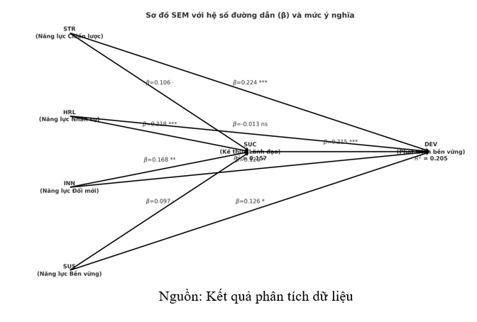 Sau khi kiểm định độ tin cậy và giá trị thang đo, nghiên cứu tiến hành mô hình phương trình cấu trúc (SEM) nhằm kiểm định các giả thuyết về mối quan hệ giữa năng lực lãnh đạo (STR, HRL, INN, SUS), kế thừa lãnh đạo (SUC) và phát triển bền vững (DEV) trong doanh nghiệp gia đình Việt Nam. (Hình 2)