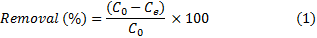 where: Ce (mg/L) is the concentration at equilibrium; C0 (mg/L) is the initial concentration.