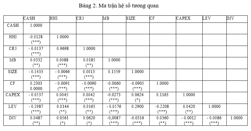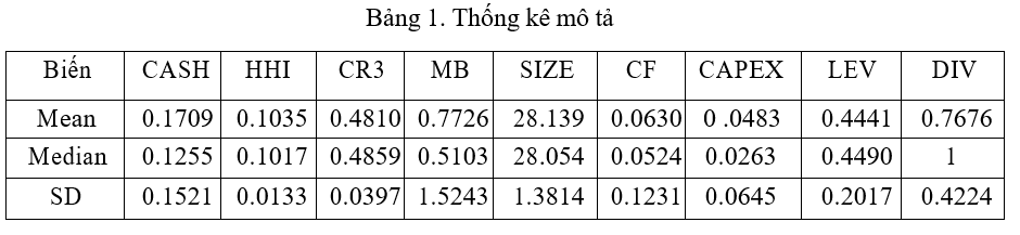 Bảng 1 cho thấy tỷ lệ tiền mặt trung bình mà các doanh nghiệp nắm giữ vào khoảng 17.09% trên tổng tài sản của doanh nghiệp và có sự chênh lệch đáng kể trong việc nắm giữ tiền mặt của doanh nghiệp tại Việt Nam. Dòng tiền hoạt động sản xuất kinh doanh của các doanh nghiệp trung bình chiếm khoảng 6.30% so với tổng tài sản của doanh nghiệp. Các doanh nghiệp đã chi tiêu vốn trung bình khoảng 4.83% trên tổng tài sản của doanh nghiệp và có sự khác biệt đáng kể trong chiến lược tăng trưởng dài hạn và hiệu quả ngắn hạn trong đầu tư của từng doanh nghiệp. Mức trung bình mà các doanh nghiệp sử dụng đòn bẩy tài chính là 44.41% trên tổng tài sản của doanh nghiệp.