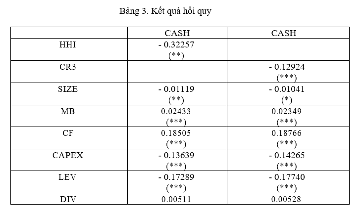 Kết quả nghiên cứu từ Bảng 3 chỉ ra mức độ tập trung ngân hàng tác động ngược chiều đến việc nắm giữ tiền mặt của các doanh nghiệp niêm yết tại Việt Nam với bất kể sử dụng thước đo HHI hay CR3, điều này hàm ý rằng khi mức độ tập trung ngân hàng của Việt Nam có xu hướng giảm dần theo thời gian thì mức độ nắm giữ tiền mặt của các doanh nghiệp tại Việt Nam sẽ có xu hướng tăng dần. Điều này lại ủng hộ lý thuyết thông tin hơn khi cho rằng thị trường tập trung giúp củng cố quan hệ vay mượn, tiếp cận thông tin và vốn sẽ dễ dàng hơn và với lãi suất thấp, do đó doanh nghiệp sẽ nắm giữ ít tiền mặt hơn. Kết quả nghiên cứu này khác biệt với Li và cộng sự (2024) khi nghiên cứu trên thị trường tài chính đã phát triển tại Mỹ với kết quả nghiên cứu ủng hộ lý thuyết sức mạnh thị trường.