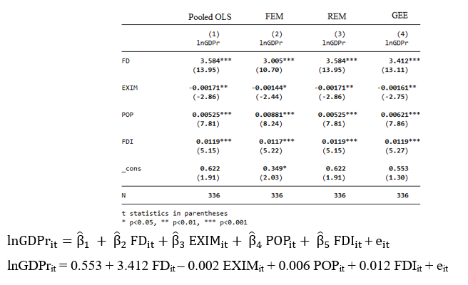 Kết quả phân tích định lượng từ mô hình GEE với biến phụ thuộc là tốc độ tăng trưởng kinh tế (lnGDPr) chỉ ra rằng các yếu tố như phát triển tài chính (FD), quy mô dân số (POP) và dòng vốn đầu tư trực tiếp từ nước ngoài (FDI) đều tạo ra ảnh hưởng tích cực, có ý nghĩa thống kê đối với tăng trưởng kinh tế ở nhóm quốc gia Đông Á trong khoảng thời gian nghiên cứu. Cụ thể, hệ số ước lượng của biến phát triển tài chính (FD) đạt giá trị 3.412 và có ý nghĩa thống kê ở mức 1% cho thấy mối liên hệ dương và có ý nghĩa rõ rệt về mặt kinh tế. Kết quả này cũng góp phần củng cố cho luận điểm lý thuyết rằng một thị trường tài chính phát triển có khả năng thúc đẩy tăng trưởng thông qua việc tăng cường hiệu quả phân bổ nguồn vốn và giảm chi phí thông tin, kết quả phù hợp với lý thuyết thuộc trường phái cổ điển và tăng trưởng nội sinh.