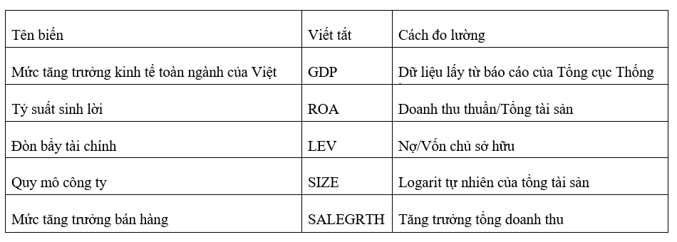 Trong đó, Risk là biến phụ thuộc biểu thị mức độ chấp nhận rủi ro của doanh nghiệp. Tiếp theo là các biến kiểm soát có ảnh hưởng đến mức độ chấp nhận rủi ro của doanh nghiệp, kế thừa từ các nghiên cứu của John và cộng sự (2008), Faccio và cộng sự (2016): tỷ suất sinh lời (ROA), đòn bẩy tài chính (LEV), quy mô công ty (SIZE) và mức tăng trưởng bán hàng (SALEGRTH). Đo lường và tính toán các biến được khái quát theo Bảng 1.