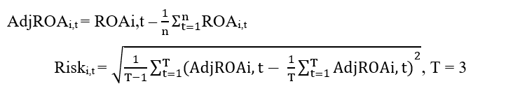 Trong đó, AdjROA được định nghĩa là ROA điều chỉnh theo ngành, được tính bằng hiệu của ROA công ty i năm t và ROA trung bình công ty i trong toàn bộ thời gian 6 năm nghiên cứu (2016 - 2021). Từ AdjROA đã tính, tác giả sử dụng để tính toán biến RISK - mức độ chấp nhận rủi ro của công ty i năm t. Biến RISK được tính theo cách sau: độ lệch chuẩn của ROA điều chỉnh theo ngành trong khoảng thời gian 3 năm có trùng lặp (2016-2018, 2017-2019,...)
