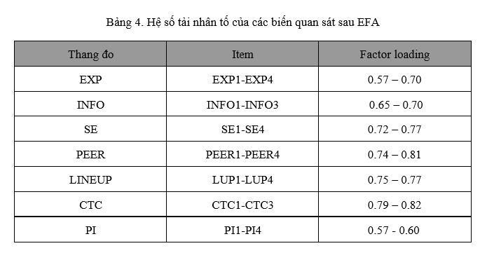 Phân tích nhân tố khám phá (EFA) để đánh giá giá trị hội tụ và giá trị phân biệt;