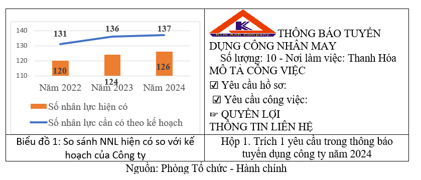 + Hoạch định NNL: được thực hiện qua các bước: (1) Phân tích hiện trạng nguồn nhân lực được thực hiện bằng cách thống kê số lượng nhân viên theo từng bộ phận; (2) Xác định nhu cầu nhân lực: Công ty chưa có kế hoạch dự báo nhu cầu nhân sự dài hạn, mà chủ yếu xác định nhu cầu theo tình hình thực tế. Khi khối lượng đơn hàng tăng hoặc có nhân sự nghỉ việc, công ty mới tiến hành tuyển thêm. Điều này phản ánh cách tiếp cận mang tính ngắn hạn và bị động; (3) Xây dựng kế hoạch nguồn nhân lực mới chỉ tập trung vào việc bổ sung số lượng lao động ngắn hạn, chưa chú trọng đến phát triển dài hạn hoặc chuẩn bị đội ngũ kế cận. Điều này dẫn tới nguy cơ thiếu hụt nhân lực chất lượng cao, ảnh hưởng đến khả năng cạnh tranh của doanh nghiệp; (4) Triển khai và giám sát kế hoạch: được thực hiện kịp thời theo nhu cầu phát sinh, với sự giám sát trực tiếp từ ban giám đốc. Tuy nhiên, hoạt động giám sát mới dừng lại ở khía cạnh số lượng, chưa có hệ thống chỉ tiêu đánh giá toàn diện về hiệu quả sử dụng lao động. (Biểu đồ 1, Hộp 1)