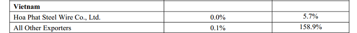Đối với Việt Nam, CBSA công bố biên độ bán phá giá cho Công ty TNHH Thép dây Hòa Phát ở mức 5,7%, thấp nhất trong các doanh nghiệp bị điều tra và giảm hơn một nửa so với biên độ điều tra sơ bộ 13,4%. Các nhà xuất khẩu khác của Việt Nam bị xác định biên độ bán phá giá ở mức 158,9%.