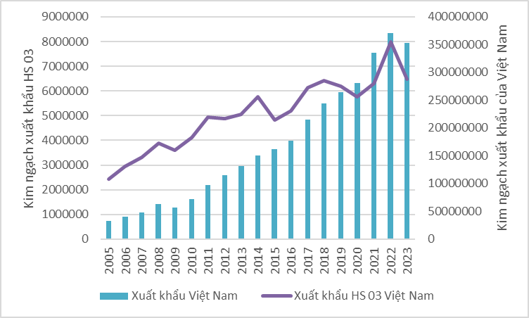 Hình 1: Kim ngạch xuất khẩu mã HS 03 và tổng kim ngạch xuất khẩu của Việt Nam