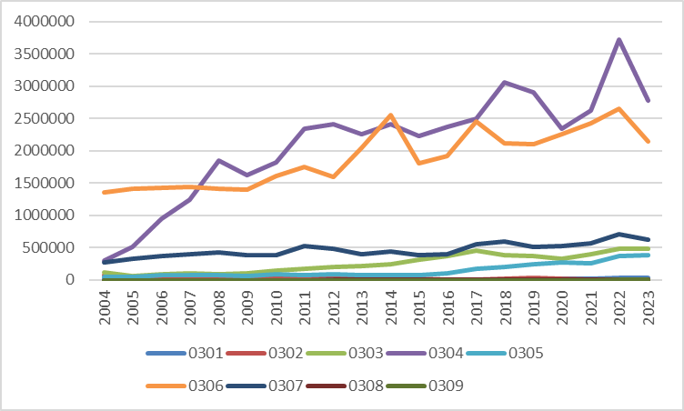 Các mặt hàng thủy sản mã HS 03 gồm cá và động vật giáp xác, động vật thân mềm và động vật thuỷ sinh không xương sống khác. Các mặt hàng này được chia thành 9 nhóm. Số liệu thống kê từ ITC cho thấy kim ngạch xuất khẩu của cả 9 nhóm hàng đều có xu hướng gia tăng theo thời gian. Tuy nhiên, ngành hàng xuất khẩu này chịu sự chi phối mạnh mẽ của hai nhóm sản phẩm chủ lực là nhóm 0304 (phi lê cá và các loại thịt cá khác - đã hoặc chưa xay, nghiền, băm, tươi, ướp lạnh hoặc đông lạnh) và nhóm 0306 (động vật giáp xác, đã hoặc chưa bóc mai, vỏ, sống, tươi, ướp lạnh, đông lạnh, làm khô, muối hoặc ngâm nước muối; hun khói; đã hoặc chưa làm chín trước hoặc trong quá trình hun khói, đã hấp chín hoặc luộc chín trong nước; bột thô, bột mịn và viên của động vật giáp xác, thích hợp dùng làm thức ăn cho người). Minh chứng rõ nét là tỷ trọng của hai nhóm hàng này luôn chiếm hơn 70% tổng kim ngạch xuất khẩu thuỷ sản mã HS 03 của Việt Nam. Cụ thể, giá trị xuất khẩu của 2 nhóm hàng này lần lượt là 300 triệu USD và 1,363 tỷ USD vào năm 2004 và ghi nhận mức kỷ lục là 3,727 tỷ USD và 2,651 tỷ USD cho từng nhóm vào năm 2022. Trong khi đó, các phân khúc còn lại trong ngành thể hiện một bức tranh khá đối lập. Bảy nhóm hàng khác chủ yếu duy trì mức xuất khẩu dưới 500 triệu USD mỗi nhóm. Đặc biệt, nhóm 0309 là một mã hàng tương đối mới, chỉ bắt đầu được khai thác xuất khẩu từ năm 2022 và mang về kim ngạch khiêm tốn 108 triệu USD. Tương tự, nhóm 0308, mặc dù đã có mặt trên thị trường xuất khẩu từ năm 2012, cũng chỉ đạt kim ngạch khoảng 2,15 triệu USD. (Hình 3)