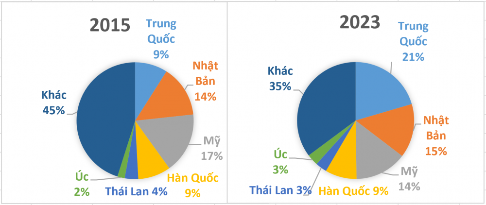 Phân tích xu hướng thị trường trong những năm gần đây cho thấy Trung Quốc đã vươn lên mạnh mẽ, trở thành thị trường xuất khẩu thủy sản lớn hàng đầu của Việt Nam. Cụ thể, kim ngạch xuất khẩu sang thị trường này đã gia tăng ấn tượng 203%, từ mức xấp xỉ 436 triệu USD vào năm 2015 lên đến khoảng 1,322 tỷ USD vào năm 2023. Giá trị này tương ứng với 20,45% tổng kim ngạch xuất khẩu thuỷ sản của Việt Nam trong năm đó. Nhật Bản vẫn khẳng định là đối tác quan trọng của Việt Nam, thậm chí, vượt Mỹ để chiếm lấy vị trí thứ 2 với kim ngạch xuất khẩu đạt 965 triệu USD, tương đương 15% tổng kim ngạch xuất khẩu thủy sản của Việt Nam trong năm 2023. Mỹ xếp ở vị trí thứ 3, ghi nhận kim ngạch xuất khẩu là 928 triệu USD, chiếm 14% tổng kim ngạch xuất khẩu thuỷ sản của nước ta trong cùng năm. Đứng ở vị trí thứ 4 là Hàn Quốc, đóng góp 9% vào tổng giá trị xuất khẩu toàn ngành với gần 563 triệu USD. Tiếp theo, Thái Lan và Úc cũng là những thị trường đáng kể khi xuất khẩu sang mỗi nước đóng góp khoảng 205 triệu USD vào giá trị xuất khẩu toàn ngành, với tỷ trọng là 3% trong năm 2023.
