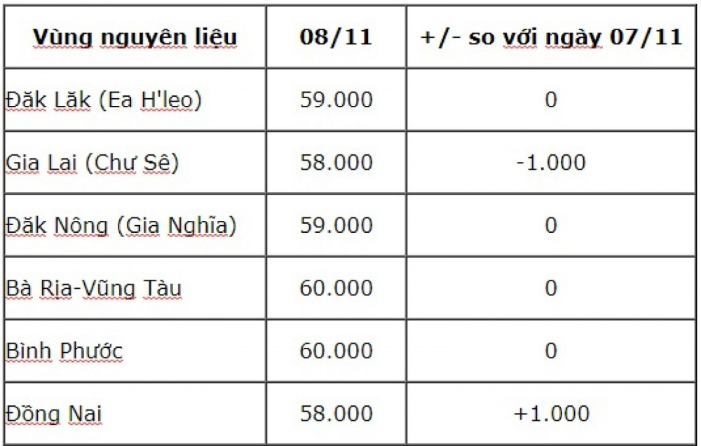 Còn tại các vùng nguyên liệu khác như Đăk Lăk, Đăk Nông, Bà Rịa – Vũng Tàu và Bình Phước giá không đổi đi ngang so với ngày hôm qua 7/11/2018.