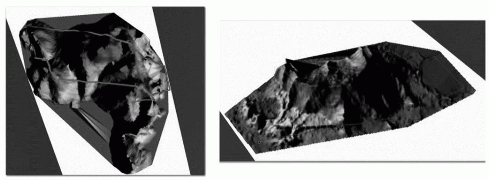 Hình 3: Mô hình số DEM mỏ Trại Sơn - Hải Phòng (năm 2010, trái) và hiện trạng còn lại (2017, phải)