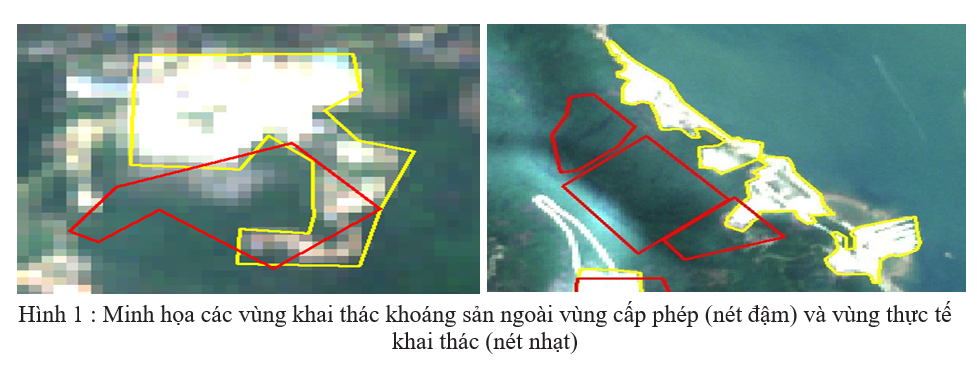 Theo Lê Minh Huệ và cộng sự, (2022), khi sử dụng kết hợp ảnh vệ tinh và ảnh chụp từ UAV để giám sát hoạt động khai thác khoáng sản tại 10 mỏ đá tại huyện Lục Yên và huyện Yên Bình, tỉnh Yên Bái, kết quả cho thấy, tất cả các mỏ khai thác khoáng sản đều không đúng vị trí cấp phép như khai thác ngoài vùng cấp phép, rộng hơn vùng cấp phép, diện tích không đúng cấp phép rất lớn. Phần diện tích khai thác trái phép chiếm từ 50-200% diện tích cấp phép. (Hình 1)