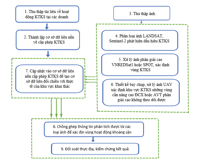 - Xác định ranh giới khai thác khoáng sản, chỉ ra diện tích khai thác được phép, vượt phép, trái phép cũng như tác động của hoạt động khai thác khoáng sản tới môi trường và biến động địa hình trong khai thác;