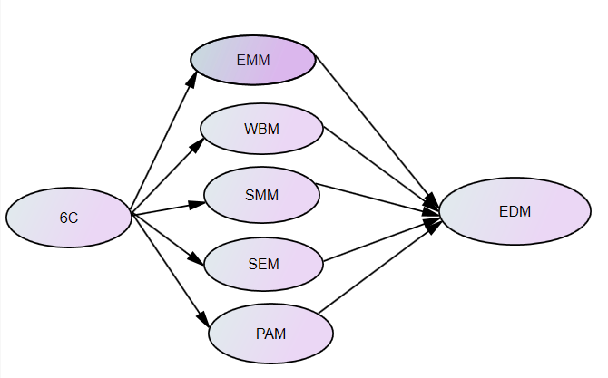 Trong bối cảnh này, mô hình 6C được phát triển để mở rộng của các khung tiếp thị truyền thống nhằm cung cấp phương pháp tiếp cận toàn diện giúp SMEs vượt qua những thách thức trên (Chaffey & Ellis-Chadwick, 2019). Mô hình này tập trung vào 6 yếu tố cốt lõi - Company, Content, Control, Community, Customers và Conversation - tạo nên chiến lược Digital Marketing có tính tương tác và định hướng quan hệ chặt chẽ (Wymbs, 2011; Key, 2017). Theo Kannan và Li (2017), những mô hình tích hợp như 6C rất cần thiết để SMEs tối ưu hóa hiệu quả từ các khoản đầu tư Digital Marketing vốn có hạn.