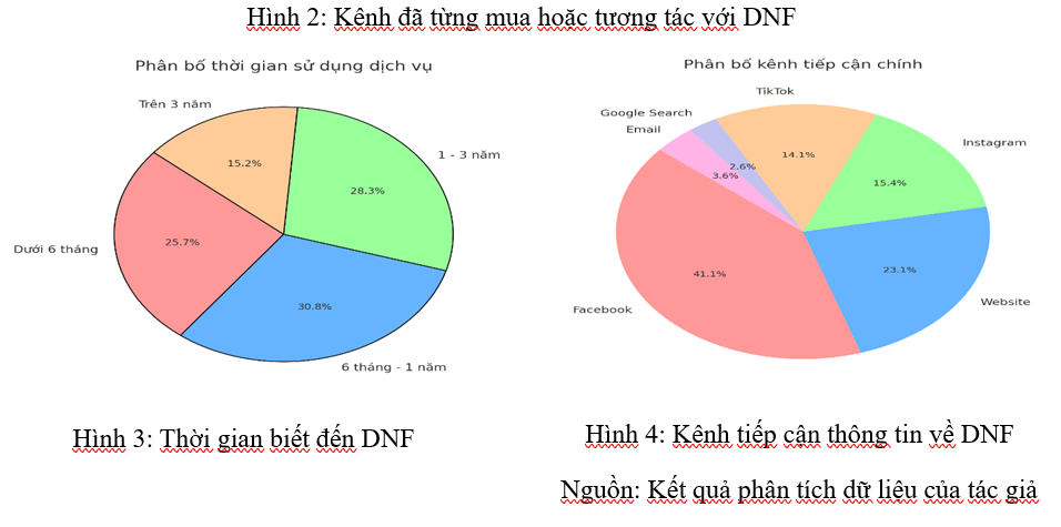 Kết quả thống kê mô tả cho thấy trong 389 đối tượng khảo sát, tỷ lệ nam (53,7%) cao hơn nữ (46,3%). Nhóm tuổi phổ biến nhất là từ 25 - 34 (36%), tiếp theo là 35 - 44 (24,4%). Đa số người tham gia có trình độ đại học (46,3%), làm việc chủ yếu trong lĩnh vực văn phòng (30,8%) và kinh doanh (21,9%). Về thu nhập, nhóm từ 5 - 10 triệu đồng/tháng chiếm tỷ lệ cao nhất (36%). Đối với hành vi tương tác với DNF, Social Media là kênh phổ biến nhất (82,2%), trong khi Email Marketing có tỷ lệ thấp (25,7%). Phần lớn người tham gia biết đến DNF trong khoảng 6 tháng - 1 năm (30,8%). Facebook là kênh tiếp cận thông tin chính (41,1%), tiếp theo là Website (23,1%) và Instagram (15,4%), trong khi Email (3,6%) có tỷ lệ thấp nhất. (Hình 2, 3, 4)